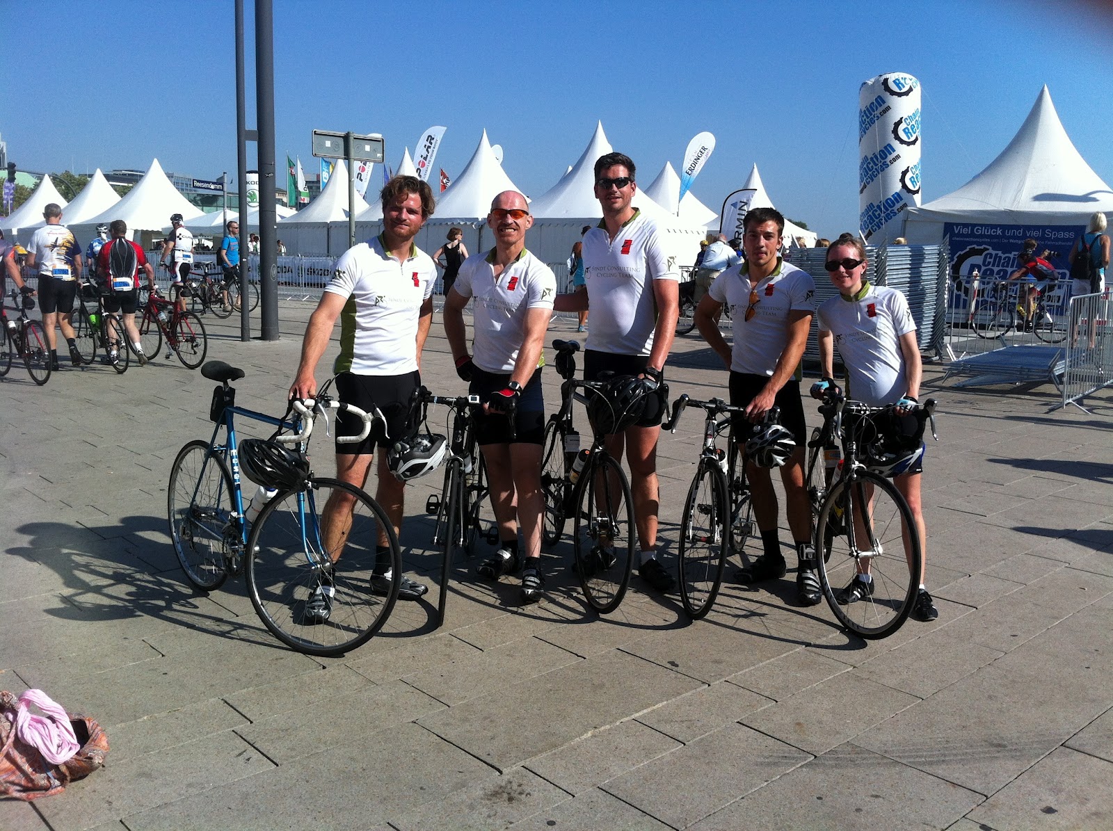 Die ersten Kilometer wollten wir ruhig angehen lassen und uns nicht von der allgemein erwarteten Hektik anstecken lassen. Entsprechend wurde das Tacho auf 36-38 km/h eingestellt und gehalten. Komisch war, dass wir schon bei diesem Tempo mit Abstand die schnellsten in unserer Umgebung waren. Nirgends war auch nur im Ansatz eine Gruppe zu sehen, die unser Tempo fahren wollte. Also griff recht bald Plan B: Mannschaftszeitfahren. Und so nahm unser Zug langsam Fahrt auf. Nach guten acht Kilometern ist Finn nach vorne gegangen und hat auf jeden Fall den Grundstein für die guten Zeiten gelegt. Bis Pinneberg hat er unglaublich das Tempo gemacht, selten unter 40 km/h und immer links. Für den Rest der Gruppe war es ein vergleichbar entspanntes fahren, so im Windschatten. Ab Pinneberg haben wir etwas mehr gewechselt und so ging es weiterhin flott und ohne größere Schwierigkeit nach Wedel. Nach knappen 55 Minuten war der Hafen von Wedel und die etwas gefürchteten Flutschwellen Geschichte. Die anschließende erste Aufwärtsfahrt ging wie alles heute flott und schon waren wir am Fuße vom Kösterberg. Der Tinsdaler Kirchweg wurde mit deutlich über 30 km/h absolviert und dann kamen meine beiden Angstgegner: Die beiden ernsthafteren Anstiege. Das ganze Team und besonders Felix haben mich wunderbar hochgezogen. Konstantin hat an der Spitze das Tempo gehalten und auch mal einen Gang rausgenommen, während mein Pulsschlag in ungeahnte Höhen geschossen ist. Nach (für mich) sensationellen 7.30 Minuten (immerhin ein 30er Schnitt über die „Berge“) war die Qual vorbei. Das wirklich unglaubliche ist, dass wir in der Gruppe auch am Berg mit die schnellsten waren, ich habe wirklich noch nie so viele Radler bergauf überholt. Das einzige Gute am bergan fahren ist, dass es anschließend runter geht. Zügig aber nicht zu schnell ging es alle Hindernisse sicher umfahrend Richtung Nienstedten. Weiterhin links und mit einem Tempo um die 50 km/h ging es zum Gegenanstieg Teufelsbrück. Hier wurde es ein wenig unübersichtlich, weil sich ein „Knäul“ an Radlern gebildet hat und kurz unser Team auseinandergerissen hat. Kurz gewartet, gesammelt und dann ging es Richtung Ziel. Langsam mussten alle deutlich auf die Zähne beißen, um das Tempo zu halten. Immerhin war noch Kraft, um ab dem Axel Springer Platz Sprintspielereien zu veranstalten, wobei sich der ein oder andere etwas verschätzte. Trotzdem sind wir alle innerhalb vom drei Sekunden ins Ziel gekommen. Ein Blick aufs Tacho hat schon die Werte geliefert, die dann auch im bisher inoffiziellen Ergebnis zu finden sind. Eine tolle Mannschaftsleistung.