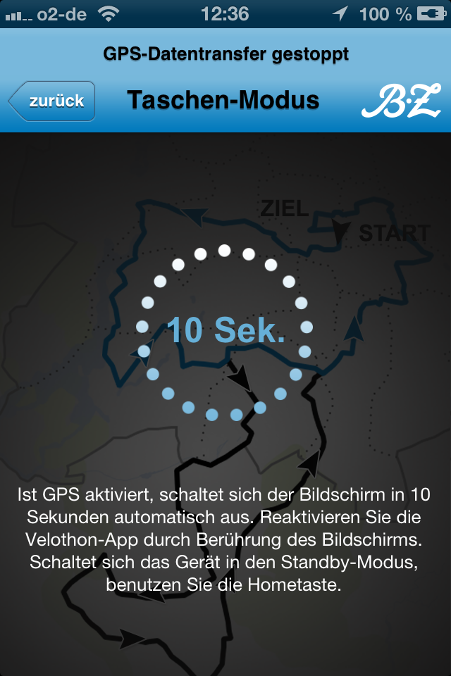 Die BZ-App kommt mit deutlich weniger Funktionen daher wie die vergangene Cyclassics-App und eine Funktion vermisse ich ganz besonders: Stellt man einmal das Tracking an – also das senden des GPS-Signals, kann man es nicht wieder abschalten. Zwar gibt es dafür einen Button – leider bewirkt er nichts. Das ist aus zwei Gründen unschön. Zum einen verringert sich die Akkuleistung doch extrem und zweitens will ja niemand permanent überwacht werden – auf jeden Fall nicht so offensichtlich. Ich konnte das senden des Signals erst mit der Deinstallation beenden.